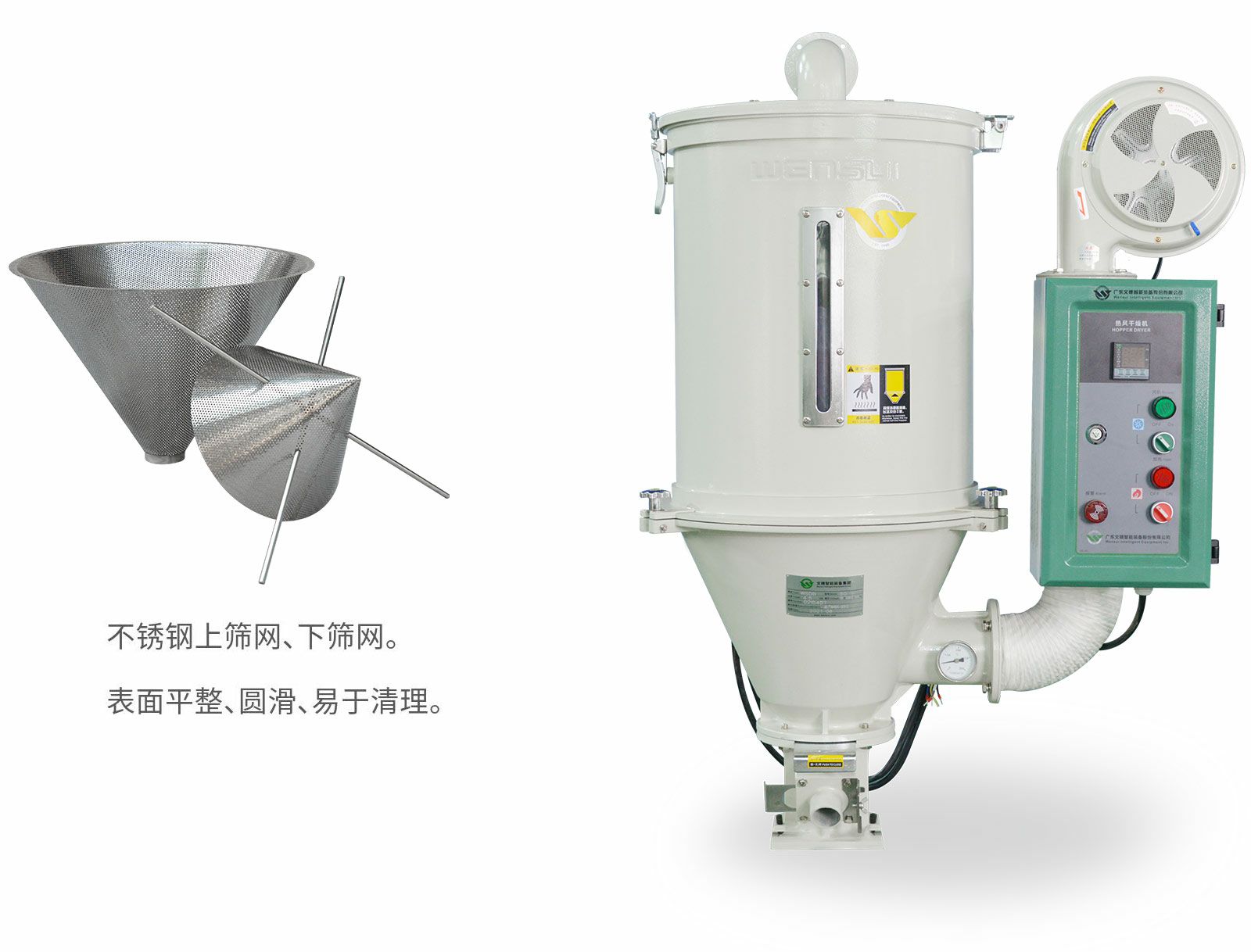性能特点原料接触面为全不锈钢材料制作。精密压铸铝质外壳,表面光滑,保温性能好。静音风机,可选配入风滤清器,确保原料清洁度。采用指针式/数显温度控制器,可精确控制温度。桶体、机座均设有视料窗,可直接观察内部原料情况。电热筒弯形设计,避免因原料粉屑堆积筒底而引起燃烧。铸铝模具自主设计,桶体向后翻,适配任何机械手。